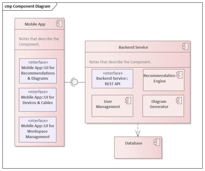 Component diagram rozdeľuje WorkNest na hlavné technické časti: mobilnú aplikáciu, backendovú službu a databázu. Ukazuje, že mobilná appka obsahuje UI pre správu pracovísk, zariadení a odporúčaní a komunikuje s backendom cez jednotné API. Backend je zasa rozdelený na moduly pre správu používateľov, výpočet odporúčaní a generovanie dát pre vizuálne schémy, pričom všetky ukladajú dáta do spoločnej databázy. Tento pohľad vysvetľuje, ako je systém navrhnutý z hľadiska architektúry a kde majú jednotlivé časti zodpovednosť.